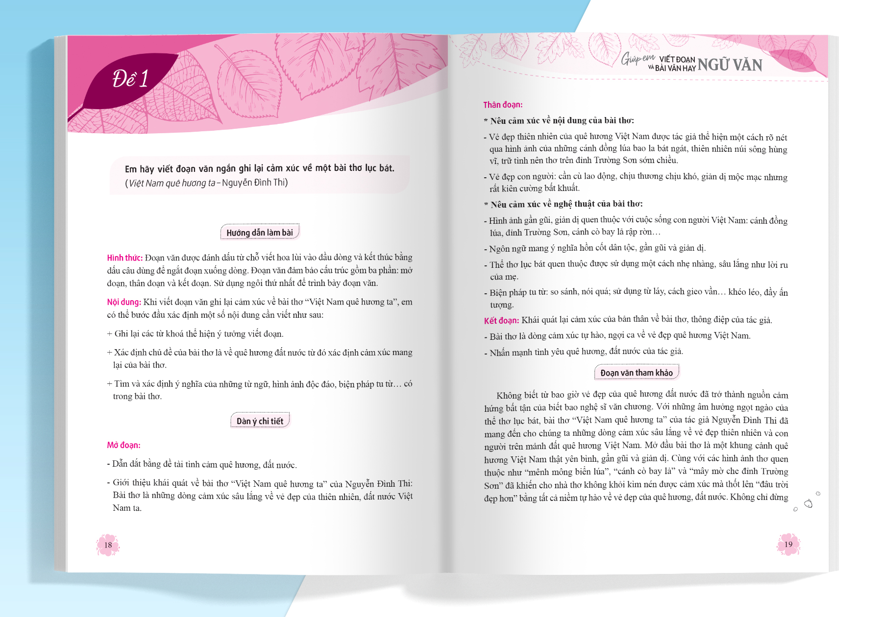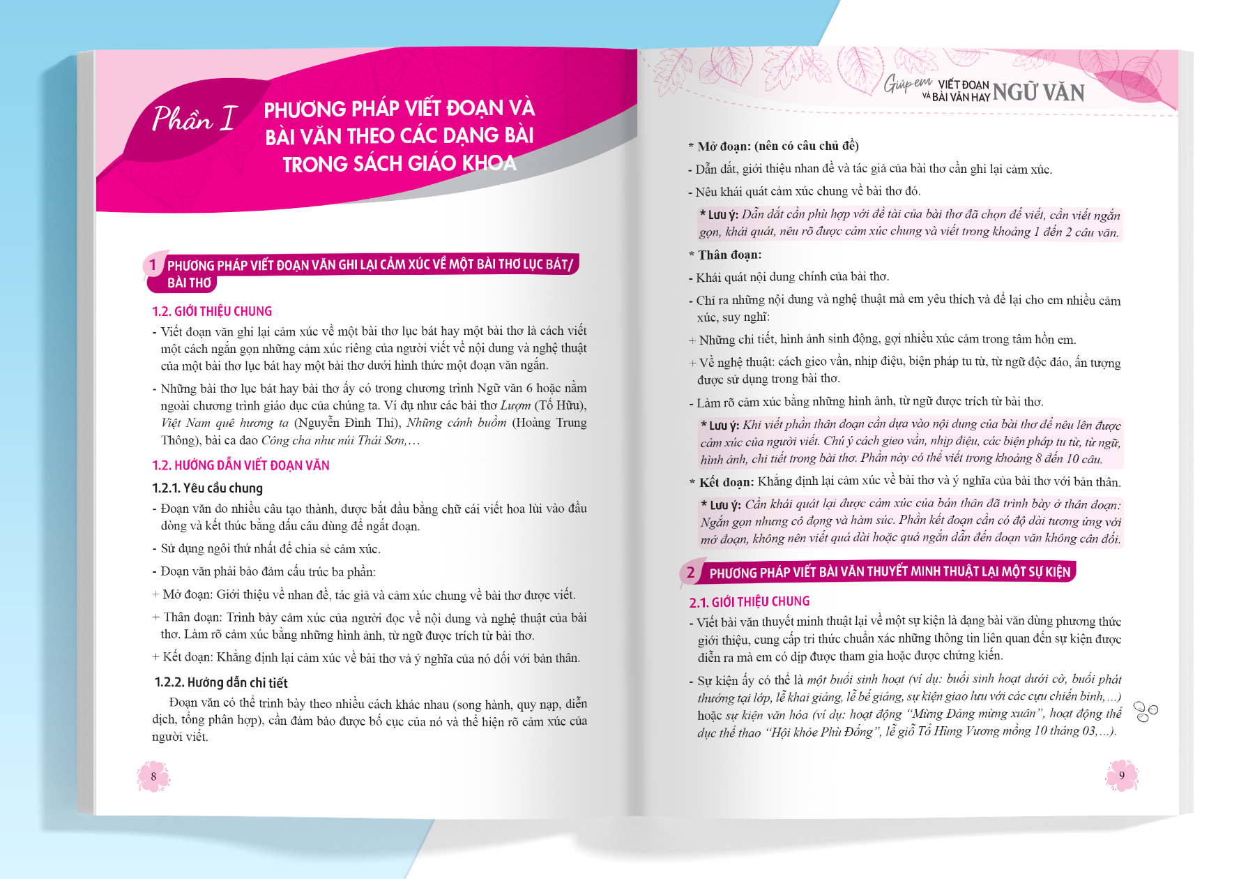 - Phương pháp viết đoạn và bài văn theo các dạng bài trong SGK: đưa ra những hướng dẫn tỉ mỉ, cụ thể cách viết đoạn văn ghi lại cảm xúc về một bài thơ lục bát/ bài thơ và viết bài văn theo từng thể loại cụ thể (thuyết minh, miêu tả, nghị luận, tự sự).